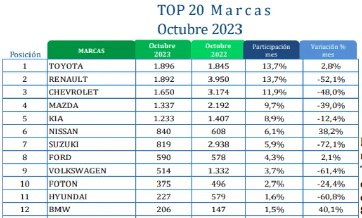 La marca que mas vendió en octubre fue Toyota, seguida de Renault. Chevrolet Mazda y Kia cerraron el top 5.