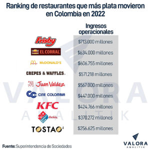 Una reciente estadística de Valora Analitik determinó que el restaurante que más se mueve en la economía colombiana es Frisby, una cadena que vende pollo frito que está en todo el país y cuyos ingresos operacionales fueron de 713.000 millones de pesos en 2022, según lo informa también la Superintendencia de Sociedades.