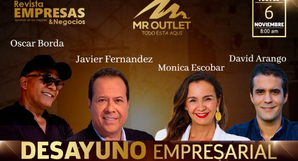Llega a Cali este 6 de noviembre al Centro Comercial MR Outlet, el SEGUNDO DESAYUNO EMPRESARIAL: APRENDE DE LOS MEJORES, con los speakers y líderes empresariales más importantes del momento, Óscar Borda, Javier Fernández, El Cantante del gol, David Arango, creador de Platanitos Coppe, Mónica Escobar, la coach y speaker Revelación del Año. Invitados especiales: Ariel Osorio, y Gerardo Solano. Motivación, liderazgo empresarial, reconocimiento, y mucho más. El Noticiero 90 Minutos recibirá de la Revista Empresas y Negocios el Reconocimiento al Mérito Empresarial por sus 35 años de trayectoria. Entradas en W Arena. Invitan: Revista Empresas y Negocios y MR Outlet.