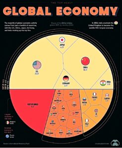 Encabezando la lista se encuentra Estados Unidos con un 25% de  representación en la economía del mundo, seguido del gigante económico que ubica a China con una sorprendente diferencia que la ubica con el 18,3% del poder económico mundial. Japón (4,3%), Alemania (4,0%) e India (3,5%), cierran el top 5 con  del 50% de la economía del mundo.